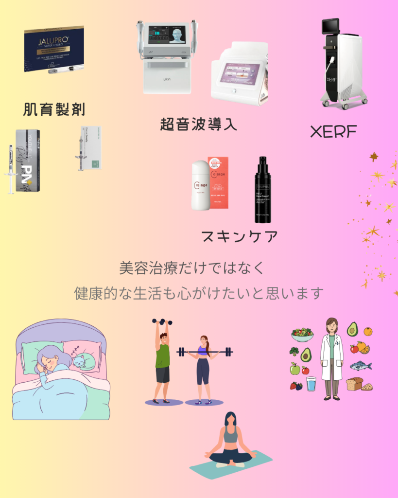 身体の健康と皮膚の健康は繋がっています。そこで食事などにも気をつけるのはもちろん、美容医療やスキンケアできることも地道に頑張ります。