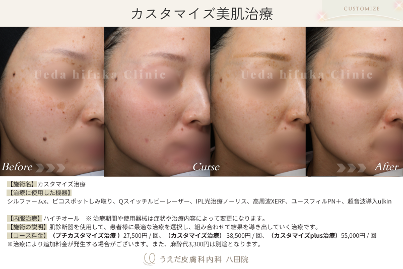 おすすめ美容治療|肌育治療|各種ピーリング|各種導入治療|しみ|そばかす|肝斑|しわ|たるみ|目のくま|にきび|にきびあと|毛穴|小顔|レーザー脱毛|薄毛|カスタマイズ治療|うえだ式コンビネーション糸リフト|HIFU|ECM製剤|ヒアルロン酸|ボトックス|ドクターズコスメ|症例写真|料金表|美容皮膚科WEB予約|美容皮膚科のお知らせ|モニター募集