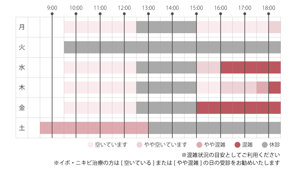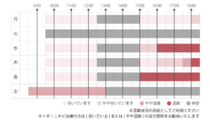 イボ・ニキビ治療の方は「空いている」または「やや混雑」の日の受診をお勧めいたします